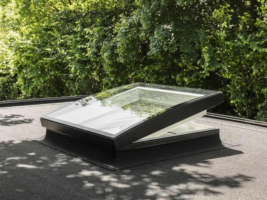 VELUX overlys med buet glass er et moderne takvindu utviklet for flate tak (0–15°) som gir maksimalt dagslys og et stilrent uttrykk. Den buede glassformen sørger for effektiv avrenning av regn og smuss, samtidig som den slanke konstruksjonen med nær usynlig ramme gir et stort glassareal og godt lysinnslipp.